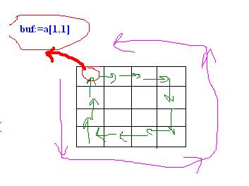 спасибо...но не много не то......под шагом тут понимается на сколько символов надо сдвинуть, а не поворот под градусом Хм.. Извини, но если ты хочешь какую-то нестандартную операцию, то изволь определить ее полностью и детально. И если под словом "дом" ты реально понимаешь гибрид слона со столом, то лучше не трать время тех, кто хочет тебе помочь. Операция "поворот", которую ты упомнинал в первом сообщении:то есть к примеру первый a[1,1] при шаге в 1 символ сдвинется на a[2,1], при шаге в 3 символа на a[4,1]... то есть поворот все же есть...но по другому Сформировать матрицу и повернуть ее по часовой стрелке на N шагов... - подразумевает (в общепринятом смысле) именно то, что я сделал (хотя слово "шаг" действительно вносит некоторое сомнение относительно того, понимаешь ли ты сам, что спрашиваешь). Твой "поворот" нигде в математике не употребляется. И если тебя не устраивает общепринятый смысл слов - приводи свой "словарь". amega тебе описал алгоритм, вот его реализация, распространенная с кромки (то есть внешнего слоя) на все слои. for i:=1 to k div 2 do begin -------------------- я - ветер, я северный холодный ветер