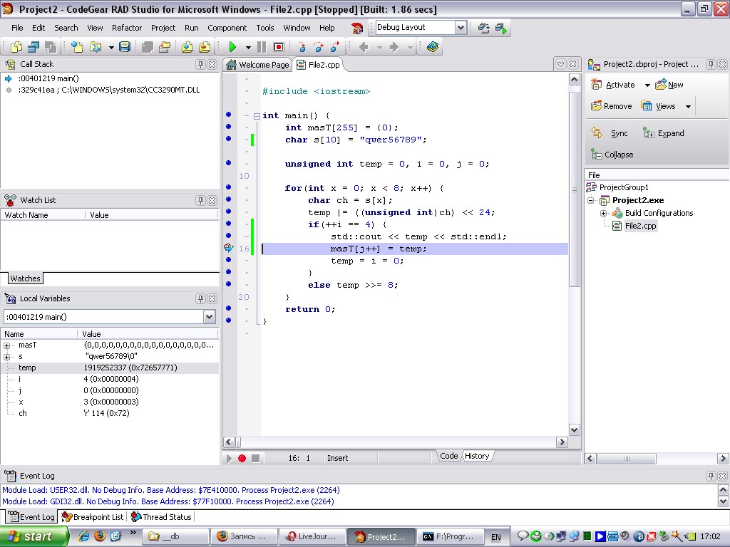 qwer - в файле i=0 ch = 0x71 temp = 0x71 i=1 temp = 0x7100 ch = 0x77 temp = 0x7177 i=2 temp = 0x717700 ch = 0x65 temp = 0x717765 i=3 temp = 0x717765 ch = 0x72 temp = 0x71776572 i=4 temp = 0x71776572 нужно же temp=72657771 Не пойму, как добиться этого, как и куда сдвигать..? |