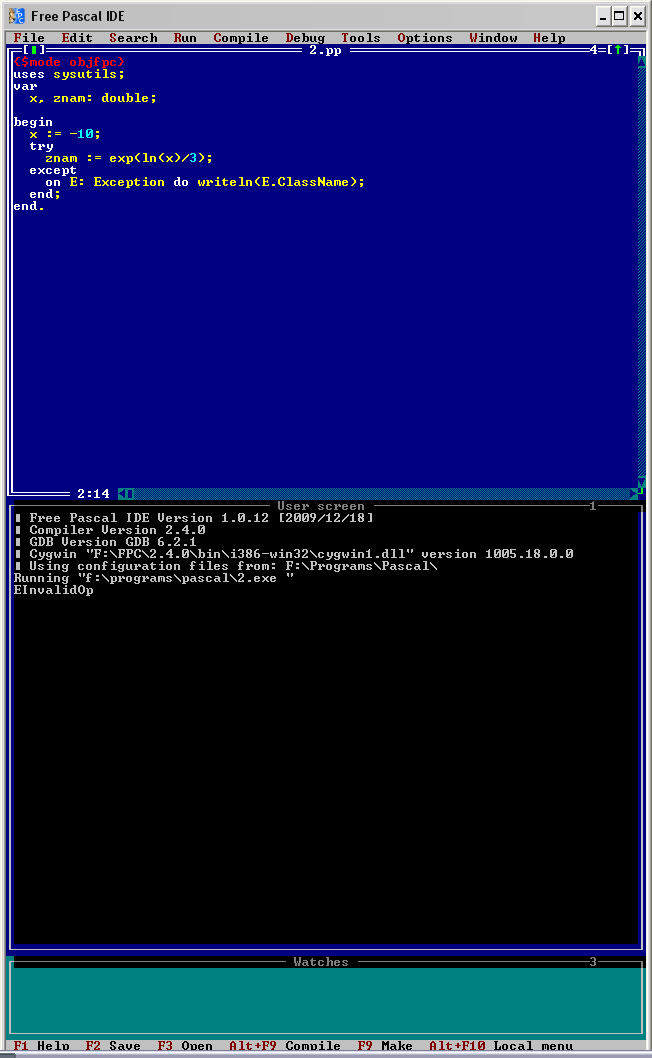 Цитата не понимаю, чем это Вам не нравится. Мне? Да я вообще ничего про себя не говорил. Я говорил о том, что в компиляторах, более продвинутых чем Турбо Паскаль, этого функционала НЕТ. Это констатация факта, и призыв подумать над тем, почему его нет. А не изобретать велосипед.Цитата это надо делать исключениями? Ну в таком случае, почему-то ФП слово try распознает как переменную: Вообще-то надо добавлять "у меня". Вот нормально настроенный FPC - не воспринимает:Кстати, здесь выбрасывается EInvalidOp, потому что нельзя вычислять логарифм от отрицательного значения. А вот использование Math.Power выбросит именно EInvalidArgument... А вообще, надо бы использовать модуль Math, там уже есть функция Power. Зачем понадобилось переписывать вручную - непонятно. |