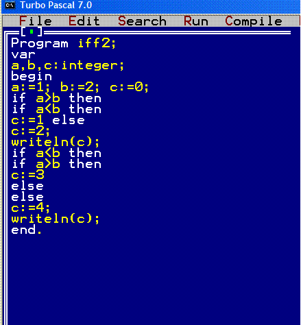 Program iff2; var a,b,c:integer; begin a:=1; b:=2; c:=0; if a>b then if a<b then c:=1 else c:=2; writeln©; if a<b then if a>b then c:=3 else else c:=4; writeln©; end. {output 0 0} ПС: есть ли возможность скопировать код из паскаля в .doc? Или из турбо паскаля 7.0 в фри паскаль иде не открывая фаил там. ППС: в фри паскале я делаю Debug -> output, Window -> tile. но после последующего Ctrl+Ф9 -> output прыгает за окно кода программы обратно. Как мне зафиксировать аутпут? PPPS: в турбо паскале если выдаёт ошибку я могу нажать Ф1 и увидеть объяснение ошибки. Как это сделать в фри паскале? Там кликая на ошибке Ф1,ктрл+Ф1, алт+Ф1 ничего не выводит. Эскизы прикрепленных изображений |