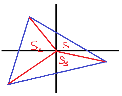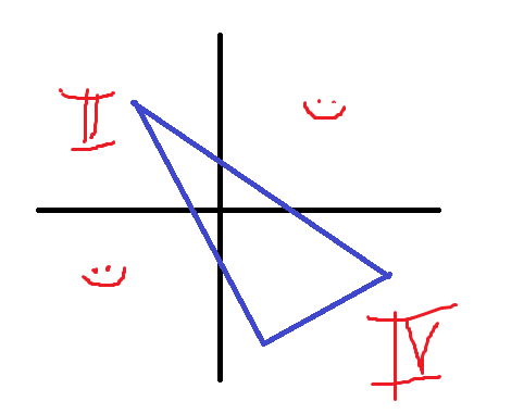 Ну да, тут за неработающее ругают) Только по логике моей программы если сторона лежит на оси координат, то начало координат не лежит в треугольнике..