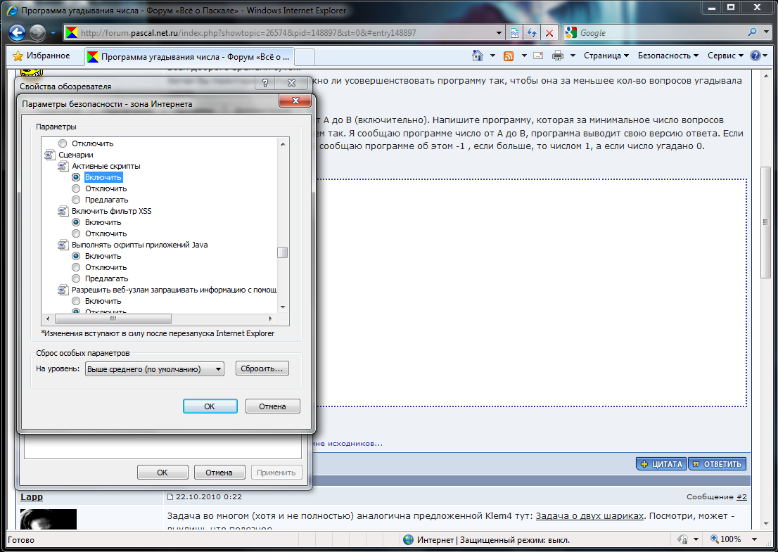Репутацию не проверял, там она мне недоступна, поскольку заходил из-под гостя. На всякий случай: я через IE8 зашел в третий (если не ошибаюсь) раз, вообще я использую другой браузер, так что никаких специальных настроек не делал. Как установился - так и есть. А ты его обновлял на какой ОСи? Обновление успешно прошло? Что с остальными сайтами, все работает, или тоже где-то да, а где-то нет? |