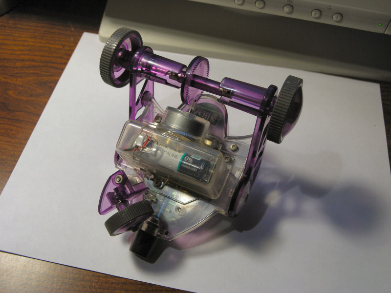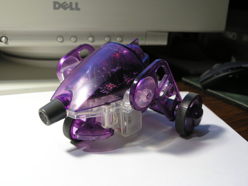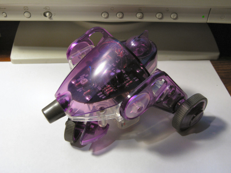Значит не только у меня такие мысли Насчет зацикливания я не подумал, но впрочем, это реализуется механически. С другой стороны - как может быть зацикливание? Ведь стенка никуда не убирается....... Кстати, такой механизм, позволит обходить некоторые препятствия... Lapp, а можешь сфотографировать этот набор? Дык. Идея автономного робота - это очень интересно. Зацикливание возможно, если окружность не вполне точная (я же написал - на практике). Представь себе, что он ударился о небольшой столбик, поехал назад, а потом промахнулся мимо того столба.. Я думаю, в реальных условиях (не совсем ровная поверхность) это вполне возможно. Вот, сфотографировал.. Не набор, конечно, а в собранном виде. Коробка выкинута, так что я даже не смог найти в Инете никаких ссылок на это дело.. А сделано очень грамотно: аккуратно, продуманно, все подходит идеально, и инструкция тоже была понятная. Правда, паять ничего не пришлось.. Дизайн мне нравится - необычный такой. А еще можно отметить, что датчик столкновения на самом деле звуковой. Он ударяется, слышит звук удара и срабатывает (микрофон прямо в носу). Так что его можно обманывать громкими звуками, типа хлопнуть в ладоши (а дочка просто визжала Переднее колесо поворачивается само по себе при езде назад, так как прикреплено на свободно поворачивающемся плече (на фото можно видеть). С повернутым передним колесом: Кверху пузом: С прямым передним колесом: -------------------- я - ветер, я северный холодный ветер