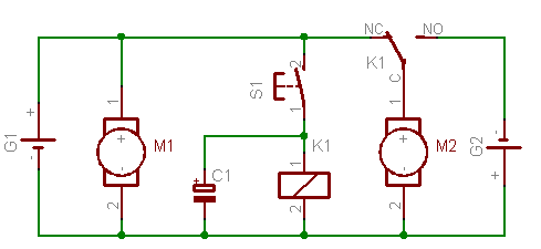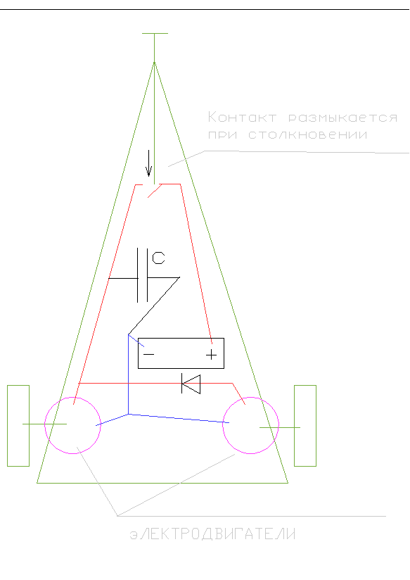 Двигатель M1 питается напряжением элемента G1 и вращается непрерывно в одном и том же направлении. Источник питания двигателя M2 - G1 или G2 - выбирается контактами реле K1. Контакт S1 кратковременно замыкается при столкновении, заряжая конденсатор С1, одновременно переключая реле. После размыкания S1, реле некоторое время остается во включённом состоянии, питаясь от конденсатора. Т. о., после столкновения двигатель M2 некоторое время вращается противоположно двигателю M1, разворачивая тележку на месте. Возможен вариант с одним элементом питания и реле с двумя переключающими группами контактов. P. S. МК и полупроводниковую логику пока отложим Добавлено через 10 мин. Диод, будучи перевёрнутым, привиделся мне в качестве источника криволинейности траектории - за счёт прямого падения на переходе на один из двигателей будет подаваться на 0,6 - 1 В меньше Сообщение отредактировано: xds - 2.07.2007 11:49 -------------------- The idiots are winning.