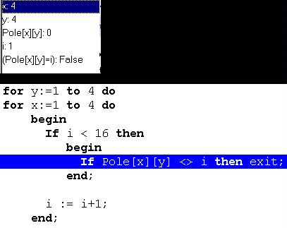 Цитата 1 2 3 4 5 6 7 8 9 10 11 12 13 14 15 0 (...правильно! игра в "15") Я, не особо крутой программер, решил этот вопрос примерно так: Код i:=1; result := false; for х:=1 to 4 do for у:=1 to 4 do begin if i<16 then begin if pole[x][y] <> i then exit; i := i+1; end; end; result := true; imho должно работать. Не работает! Лезу в отладчик, смотрю значения переменных х и у. Что за лажа... в первой же итерации х=4, и у=4. Во второй итерации х=3, у=4. Протираю глаза, смотрю в код - да нет же! У меня там нет никакого downto! А прога работает так, будто у меня цикл построен с убыванием индексов. Ладно. Может, я и идиот. Вывожу значения х не только в отладчике, а еще пишу их в caption формы. Ага! Теперь х пошел от 1 до 4, а вот у по-прежнему считается от 4 до 1. Нормально? Если я в программе написал for y:=1 to 4 do, то я вообще-то рассчитываю, что программа именно это и сделает! Даже если я отвернулся! ;) И не компиляторова ума это дело втихаря мой код переиначивать! Даже если он дурацкий! Что ли, отключить оптимизацию в опциях компилятора?... ...слегка поостыв, вижу в своем коде ошибочку... таки я идиот... циклы по х и по у надо поменять местами. Меняю... Опа! Прога заработала, так, как я и хотел. Но почему в отладчике индексы идут по-прежнему "задом наперед"??? Это ж еще зачем???? Чтобы не быть голословным, даю скриншот. Самая первая итерация цикла. По замыслу должно быть х=1, у=1, i=1, Pole[x][y]=1. В отладчике - то, что на скрине. х=4, у=4, i=1, Pole[x][y]=0. Но прога при этом работает "по замыслу", вот что меня убивает. Если бы отладчик был прав, то был бы выход из процедуры. А его не происходит. Не, забью я на программирование... пойду в балерины... Сообщение отредактировано: Бродяжник - 24.09.2004 12:30 Эскизы прикрепленных изображений |