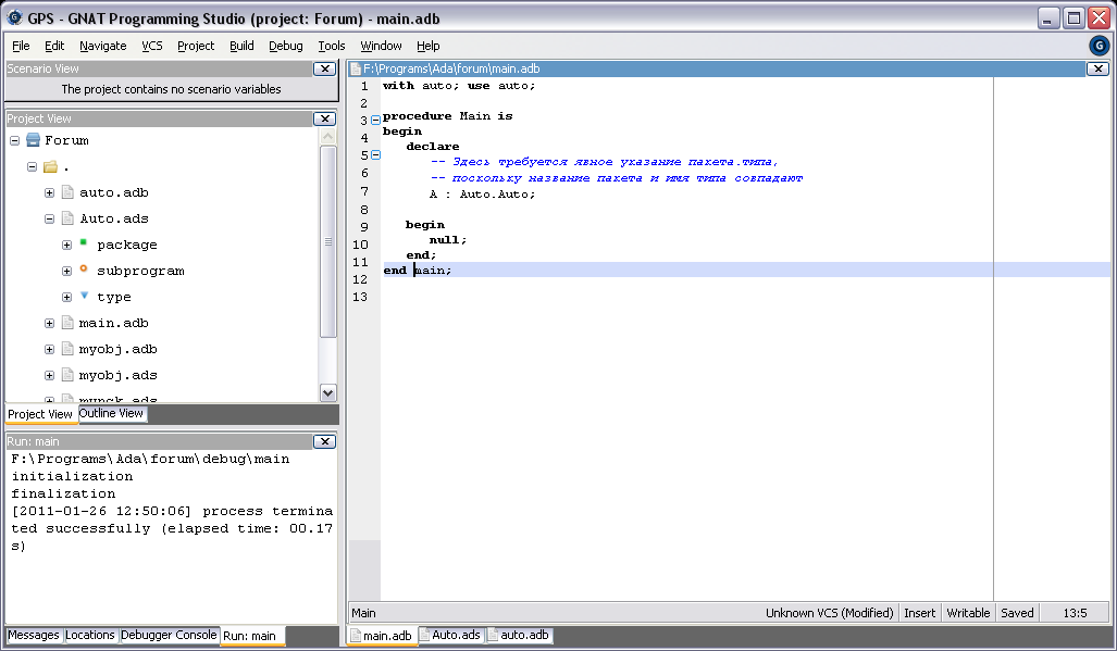 Цитата Покорение отладчика пока не удалось. Странно. Посмотрел сейчас на новом проекте. Если в настройках на закладке Switches установки вот такие:No symbol table is loaded. Use the "file" command. Gnatmake -> (галка установлена)"Debug Information" Ada -> (галка установлена)"Debug Information" Ada Linker -> (галка установлена)"Debug Information" и (галка снята)"Strip Symbols" , то дебаггер нормально запускается. В принципе, достаточно посмотреть в Messages, какая ком. строка выполняется при сборке программы. Если в вызове GCC присутствует ключ "-g", то сообщения "No symbol table is loaded" не будет. Цитата Если при компиляции ошибка, то он не перекидывает сам на ошибку Это еще более странно. Не перебрасывать на Location и на первую из найденных ошибок в коде должно только в одном случае: у компилятора вообще нет претензий к программе. Но перед началом компиляции окно Locations должно очищаться. У тебя этого, по видимому, не происходит. А что вообще показывает окно Messages? Вот то, что я вижу у себя:gnatmake -d -PF:\\Programs\\Ada\\forum\\forum.gpr main.adb --subdirs=debug -cargs -g -O0 Более глобальный вопрос: путь к GNAT Studio в переменной PATH прописан? В каком состоянии галочка в Edit->Preferences->Jump to first Location? Цитата И почему-то ничего не выводит такой код: Вот такой код не только ничего выводить не должен, он даже не откомпилируется. Вот так будет работать:(auto.ads) with Ada.Finalization; use Ada.Finalization; (auto.adb) with Ada.Text_IO; use Ada.Text_IO; (main.adb) with auto; use auto; Вот чего выдало: (заодно, если что, размер окна - 1200*600. И что, меньше информации чем в Дельфи отображается?) |