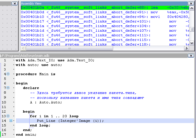 No symbol table is loaded. Use the "file" command. Если при компиляции ошибка, то он не перекидывает сам на ошибку, приходится искать вкладку Locations, листать её вниз и среди всех сообщений искать те, что относятся к последней компиляции. На мониторе 1024 на 600 меню занимает слишком много места (на код остаётся... треть высоты!). Окно с сообщениями тоже пестрит информацией, среди которой не найти нужную. По поводу автотипов. Я так понял, слова Initialize, Adjust и Finalize зашиты в язык? И почему-то ничего не выводит такой код: