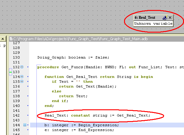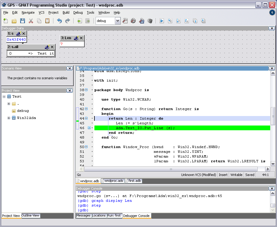 Вот тут я записал небольшое видео, прекрасно показывается окно переменных при инициализации/финализации дебаггера... И окно создается в режиме Debug. И строку показывает... Цитата Переменная для extended return не видна в отладчике. И это неправда. Поменял процедуру на функцию, и вот:Может, все дело - в том, что у тебя Gnat GPL 2010, а у меня - GPL 2009? Все-таки, в 2010 они вводили какие-то фичи из стандарта 2012, может, поломали чего? |