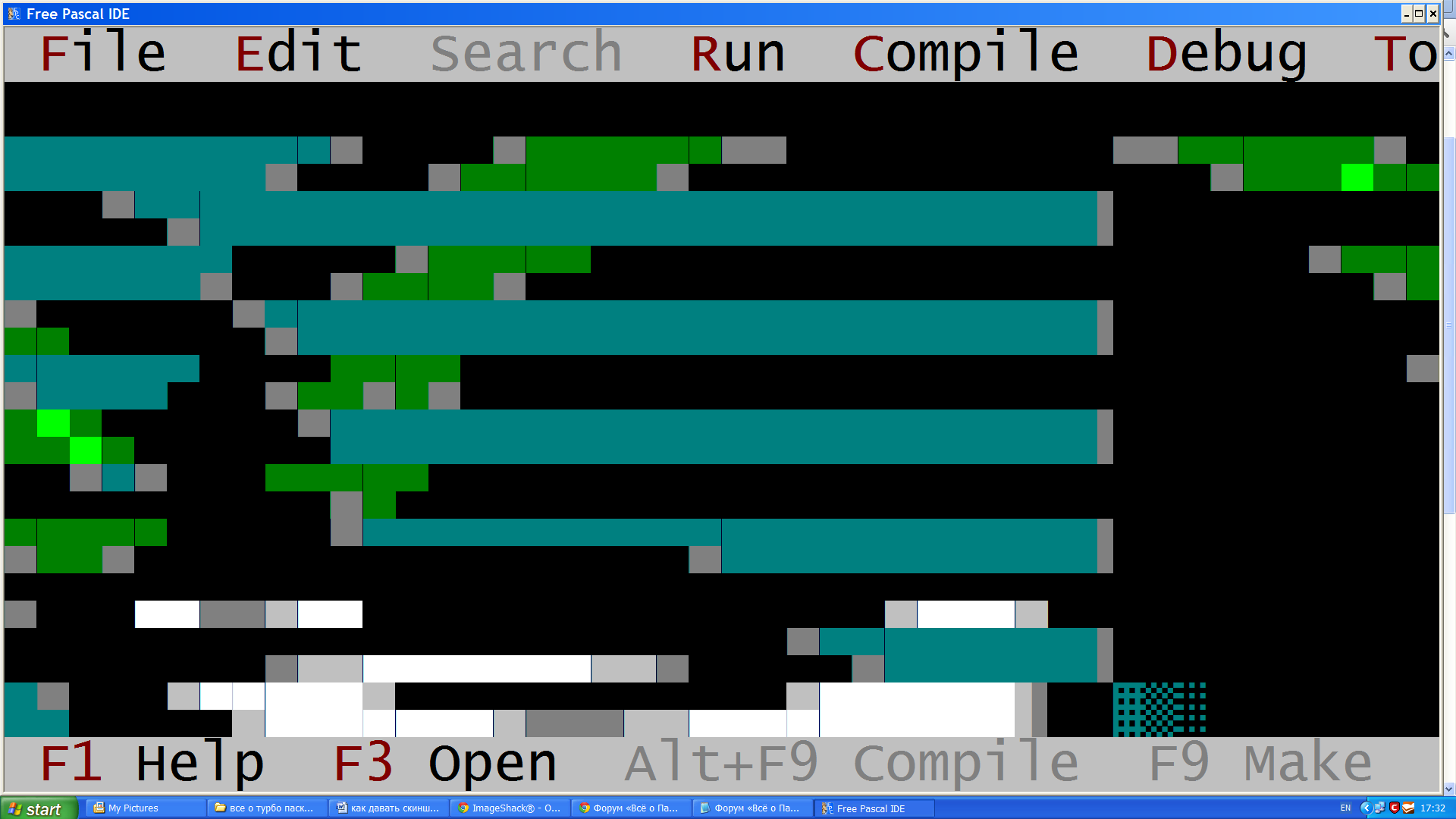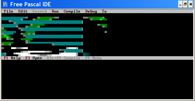 Что-то очень странное. Ни разу не видел такого. Ладно, не появляется меню, выбрать тоже нельзя? Скажем, что будет, если ты попробуешь вот в таком состоянии, как на скрине, нажать Alt+W, а потом R? (по идее это должно обновить окно FPC). Или Alt+O, E, P (а там, если удастся зайти, переключить VideoMode на что-нибудь более приемлемое, скажем, у меня выставлено 80x85color). Кстати, после перезапуска приложения картинка сохраняется?