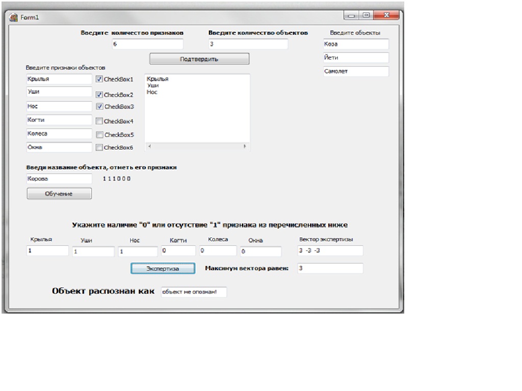 Программа должна работать следующим образом: 1)Вводим в поля нужное количество признаков и объектов, подтверждаем нажатием Кнопки «Подтвердить» 2) Вводим любые названия объектов, вводим в поле Edit8 один из них, отмечаем чекбоксы, которые соответствуют выбранному объекты , и нажимаем «Обучение». (Таким образом объект «обучается», т.е. ему присваиваются признаки выбранные нами в поле Мемо1 из всей кучи признаков) 3) Проблема в том, что не получается правильно запрограммировать кнопку «Экспертиза». При нажатии на неё, с учетом правильно заполненных эдитов – Edit13-Edit18 , в поле Edit21 должен появиться «обученный» объект, но появляется «объект не опознан!» Почему у меня не выполняется это условие в 216-й строке:? Edit21.text:= Edit8.Text Сообщение отредактировано: Екатерина - 28.10.2012 21:54 Эскизы прикрепленных изображений Прикрепленные файлы
