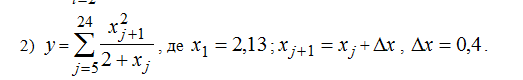 Найти значение суммы без использование массива! Мой код: Код program lab5_3; const x1=2.13; dx=0.4; var xj,y:real; j:integer; begin xj:=x1; y:=0; for j:=5 to 24 do begin if (j>5) then begin Y:=y+sqr(xj+dx)/(2+xj); xj:=xj+dx; end; end; writeln('y=',y:0:3); end. Препод говорит построение неправильно? хоть и считает значение но не то. говорит формула y не там? еше некоторые ошибки! Пршу помощь професионалов пожалуйста! Сообщение отредактировано: Misha_beginner - 8.10.2013 19:43 |