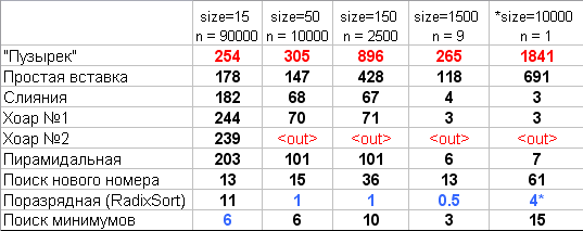 ****** ****** Сравнительная скорость работы некоторых нижеприведенных алгоритмов сортировки: Примечание: size: размер сортируемой последовательности n: количество сортировок для замера времени *: RadixSort в последнем тесте прогонялся при параметрах: size=21000; n=100 |