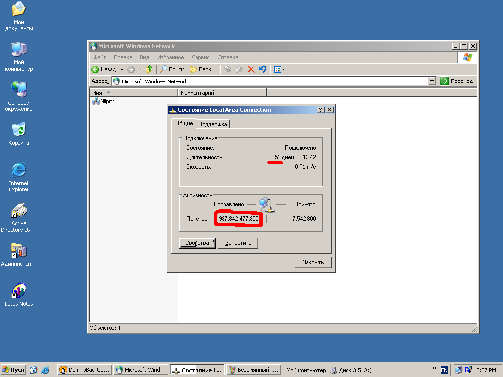 Я сам до конца не знаю отчего это. У нас на работе были проблеммы с сеткой, после того как все востановили (какой-то умник воткнул петлю в свитч, из свитча выходит, делает метра 2 петлю и обратно в свитч) вот такое обраружили на одном из серверов. Так что сказать почему такое, я не могу... Там сервер Domino стоит, возможно он репликацию с главным сервером делал часто А диски я думаю позволят такое вытворить. Сетка там гигабитная, а диски SCSI в RAID по 2. Скорость получается улетной... Цитата Похоже на жуткий паразитный трафик.. похоже... -------------------- Помогая друг другу, мы справимся с любыми трудностями!