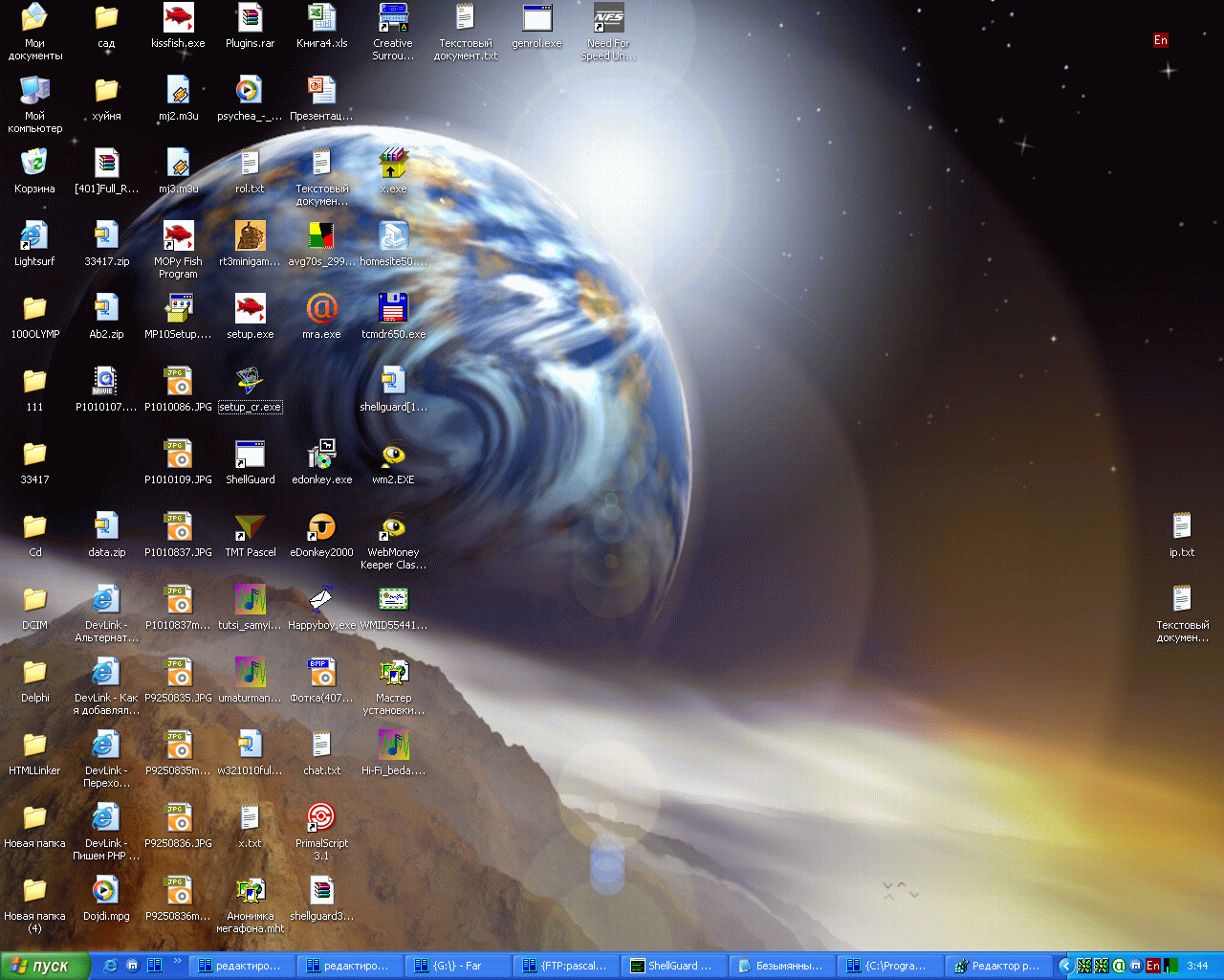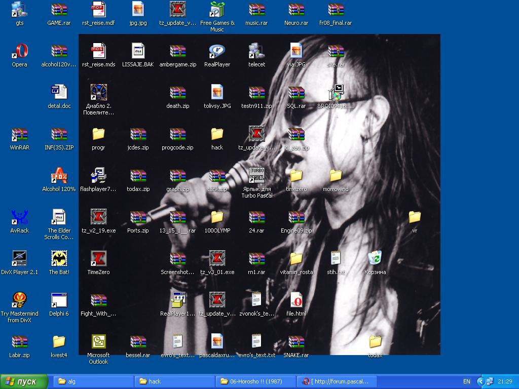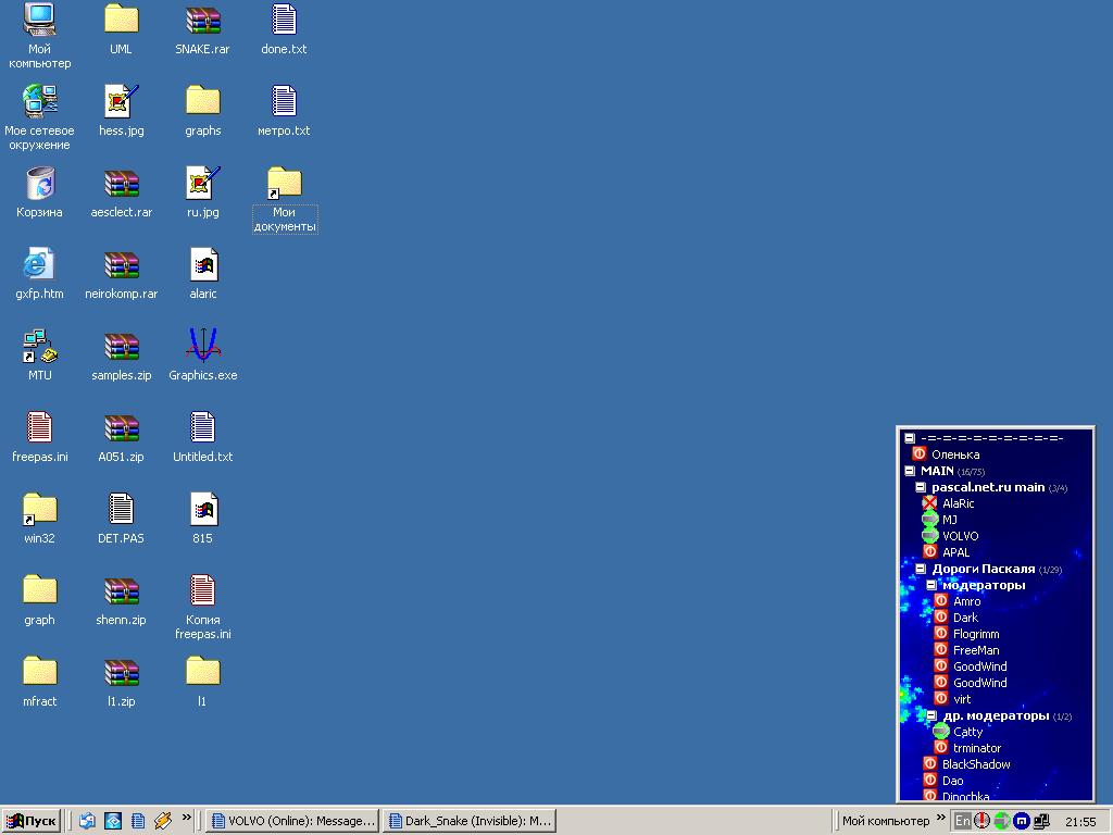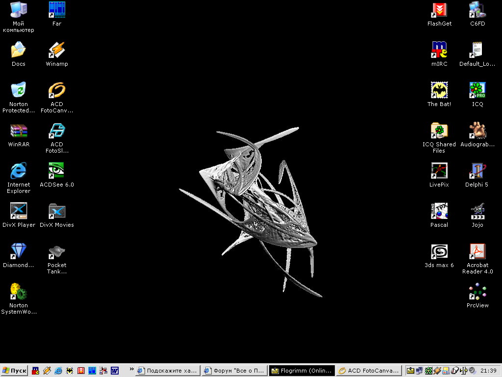 только вот насчет аськи - у нее в качесвте фона стоит кусок от фрактала.... Множество Жулиа... вырезан небольшой участок... А так мой рабочий стол - это куча всяких докоментов... вобщем там обычно бардак... Эскизы прикрепленных изображений -------------------- Помогая друг другу, мы справимся с любыми трудностями!