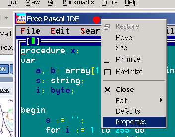Цитата Щёлкни правой на Title Bar (где написано Free Pascal IDE), и выбери Ны появляется меню... -------------------- Доброго времени суток.