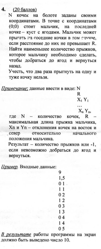 - координаты кочек - целые числа; - не существует двух кочек с одинаковыми координатами; - мальчик стоит на кочке; - ягода - клюква. Решение задачи №4. program Prob4; P.S. Ужасно оформлены условия - трактуй как хочешь! Жуть... Сообщение отредактировано: volvo - 7.11.2006 17:22 -------------------- The idiots are winning.
